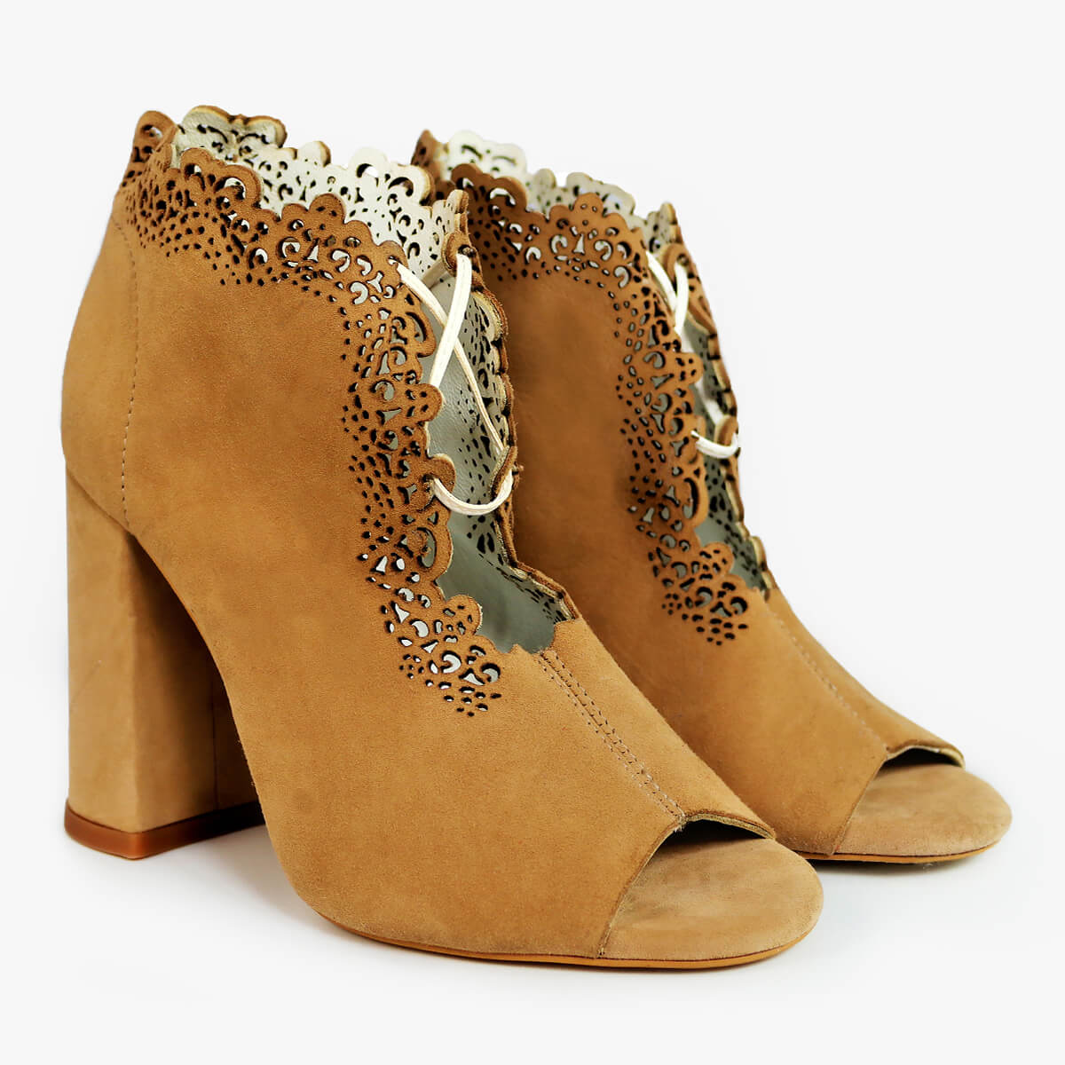 Stride confidently into the new season in a pair of Argentella open toe boots. The self-tie design features wrap-around leather laces set upon a comfortable block heel, while laser-cut embellishments inspired by lace adorn the upper.