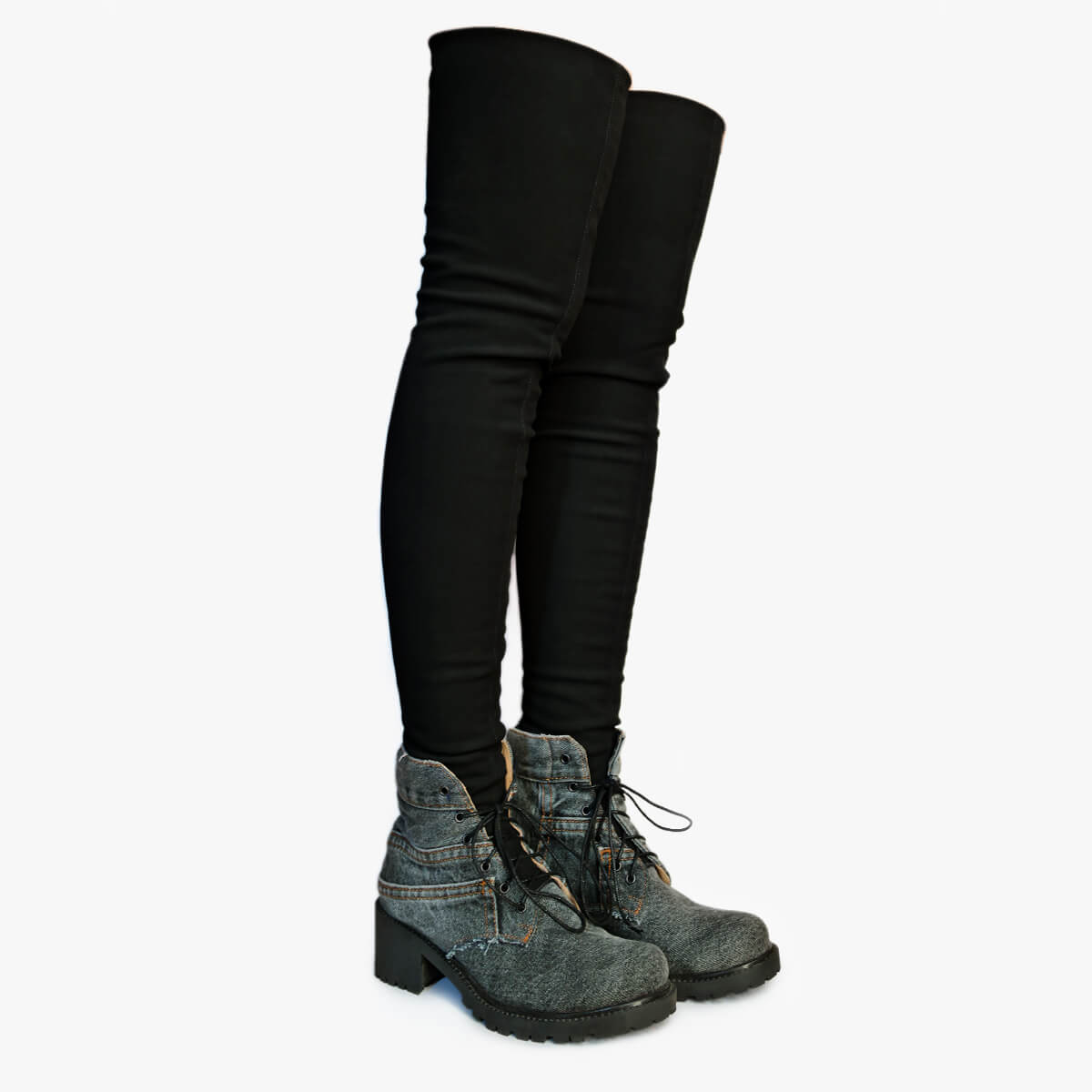 Demi boots are handcrafted from up-cycled premium quality denim. The thigh-high design is set on a chunky rubber sole.