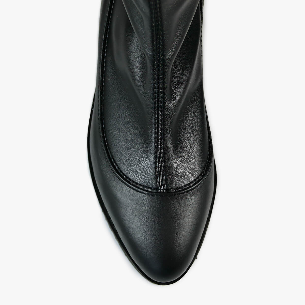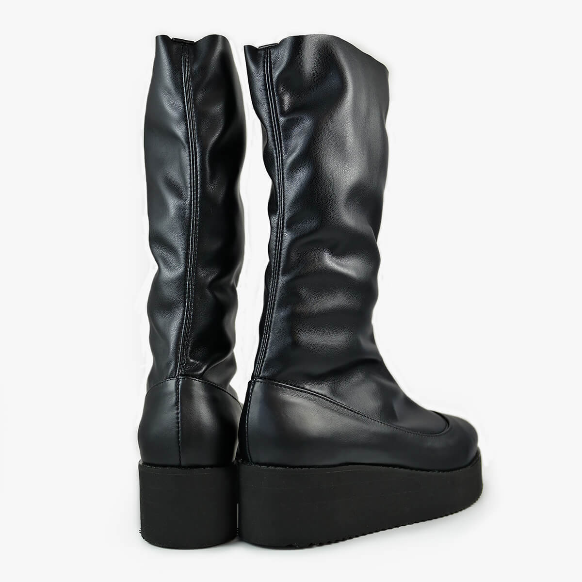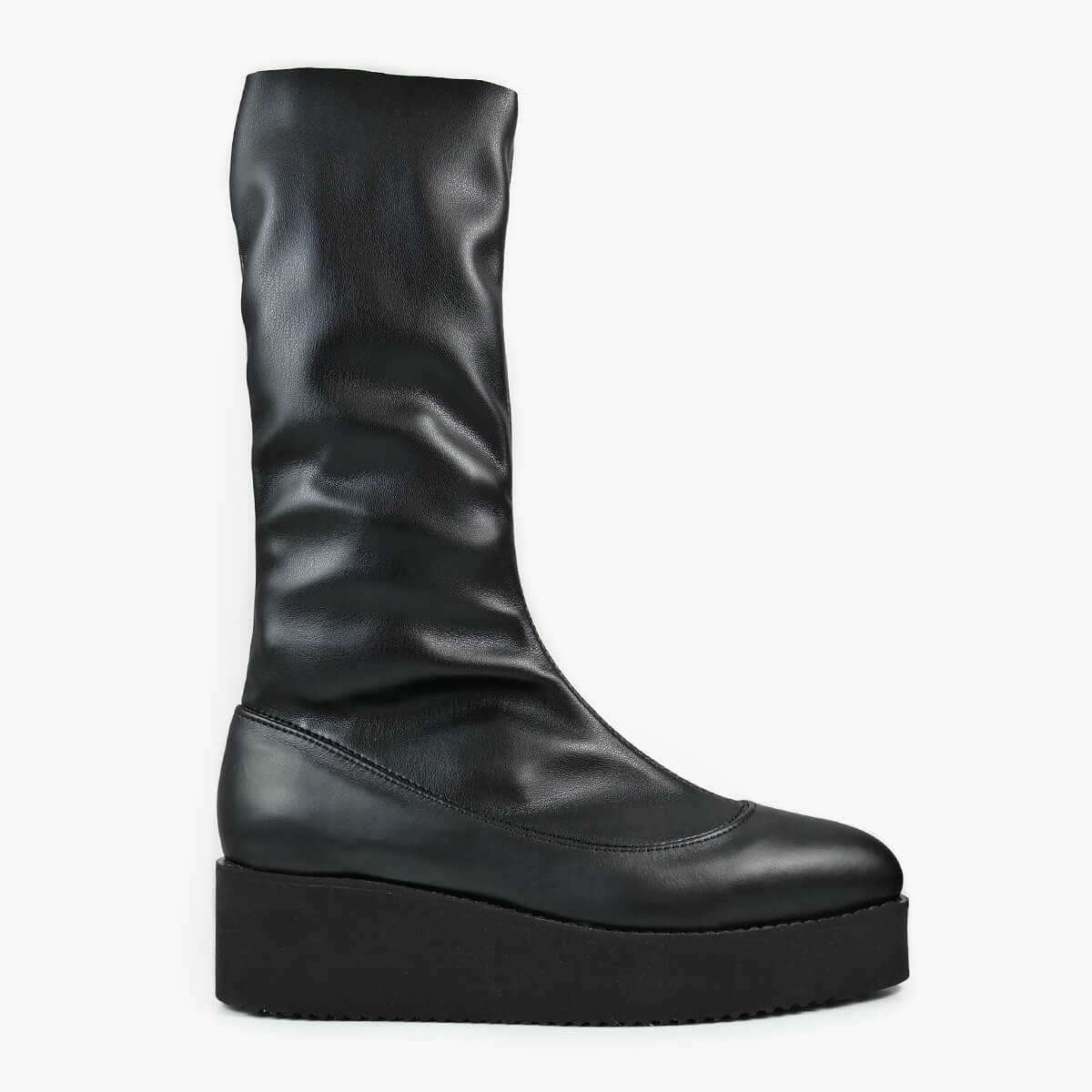 Set on a microlight platform sole, Dessi minimal boots are handcrafted from a mix of natural leather and faux stretch leather, that encases the contours of the leg beautifully. These boots are the perfect element for timeless styles.