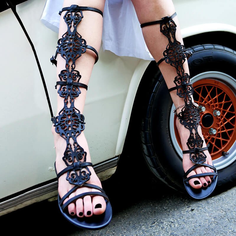 Eshalea gladiator sandals will bring a tough but luxurious attitude to your off-duty edit. The strappy silhouette is enriched with adjustable buckle straps from knee to toe, embellished with laser-cut patterns for a sophisticated look.