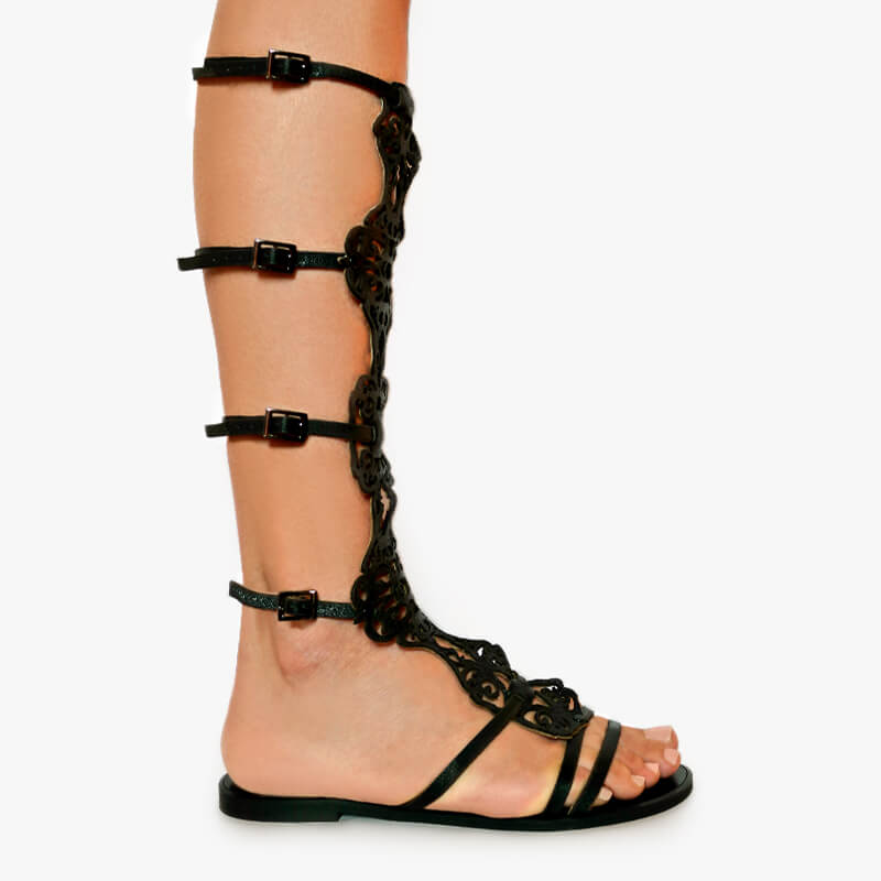 Eshalea gladiator sandals will bring a tough but luxurious attitude to your off-duty edit. The strappy silhouette is enriched with adjustable buckle straps from knee to toe, embellished with laser-cut patterns for a sophisticated look.