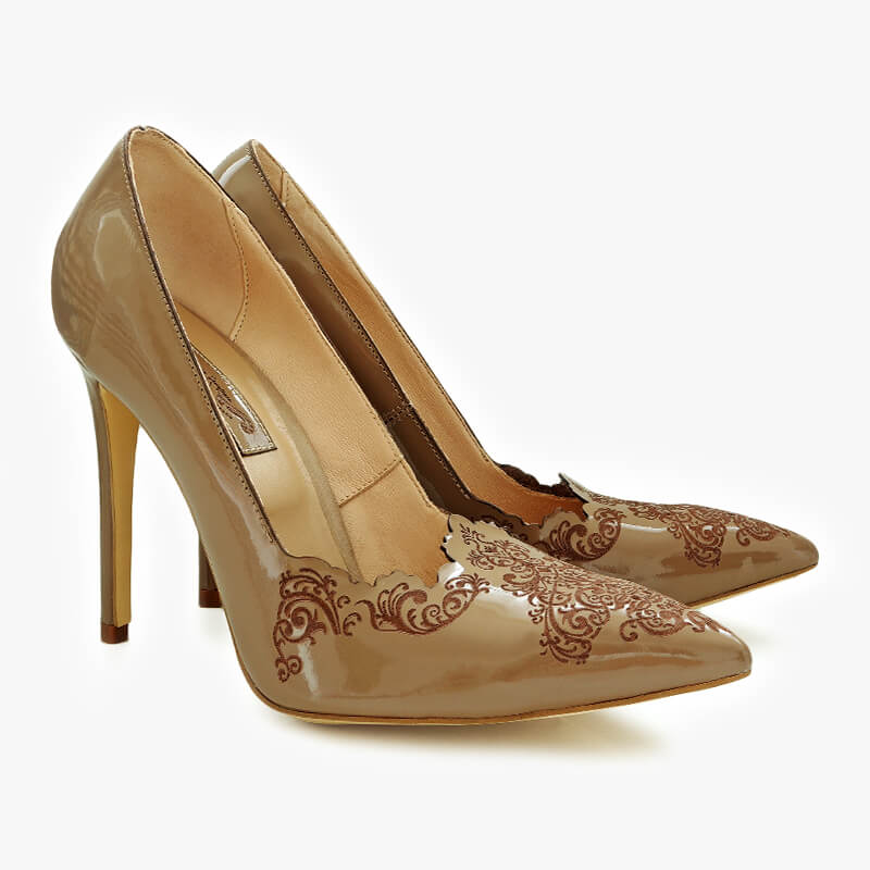 Stride confidently into your next evening event with Kabir pumps. Crafted from glossy patent leather, this pair has a sharp pointed toe and is set on a stiletto heel, while eye-catching engraved arabesque patterns command attention.