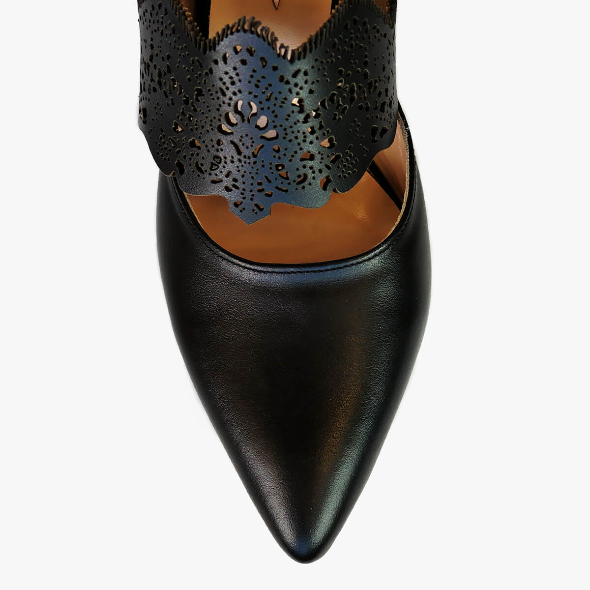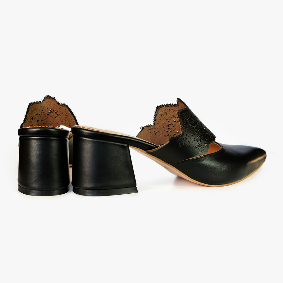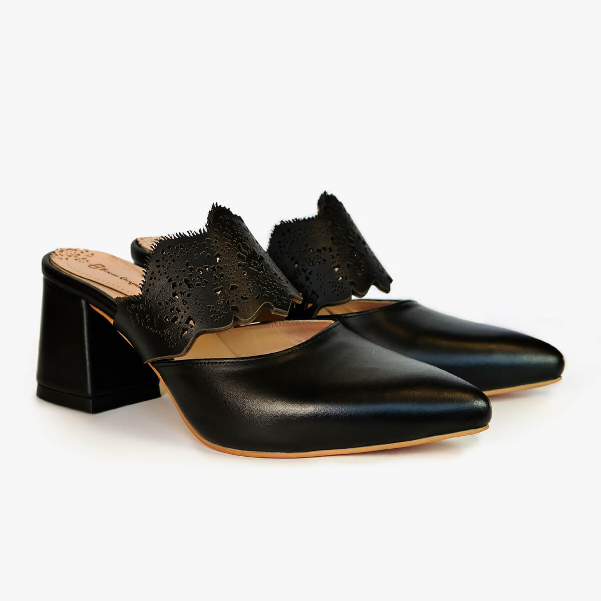Add elegance to your steps with Mechlin laser-cut embellished mules. Inspired by lace beauty, this slip-on design is handcrafted from black leather and features a backless, pointed-toe silhouette that stands on a comfortable block heel.