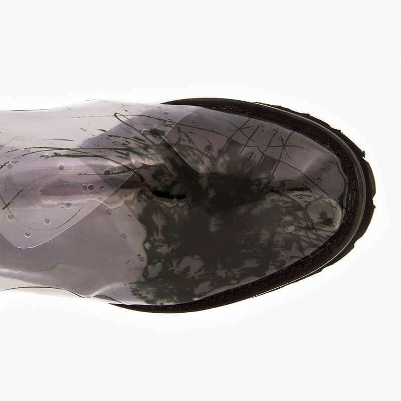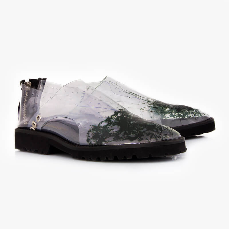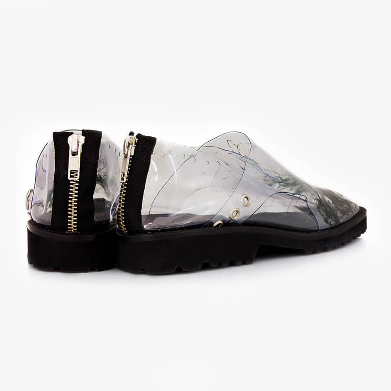 Add a statement piece to your footwear edit with Monocrystal rust inspiration comfortable flats. The design is handcrafted from transparent silicone imprinted with abstract shapes and is set on a microlight sole.