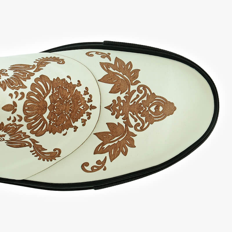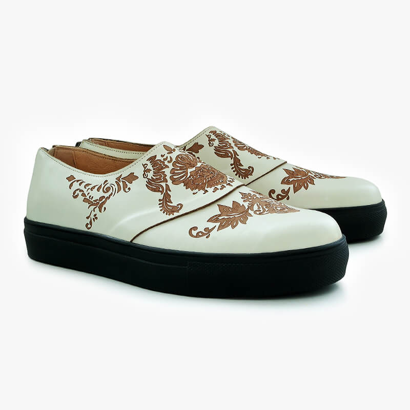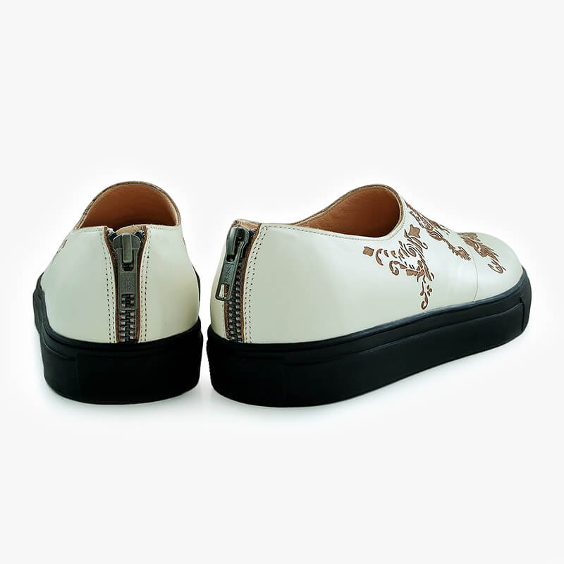 Mshatta Islamic inspiration sneakers are handcrafted from natural leather and a comfortable rubber sole. The design is embellished with engraved arabesque patterns and features a back zipper.