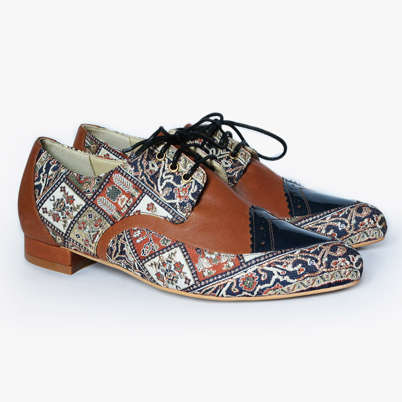 Persian inspiration shoes handcrafted from natural leather and decorated with embroidered oriental textiles.