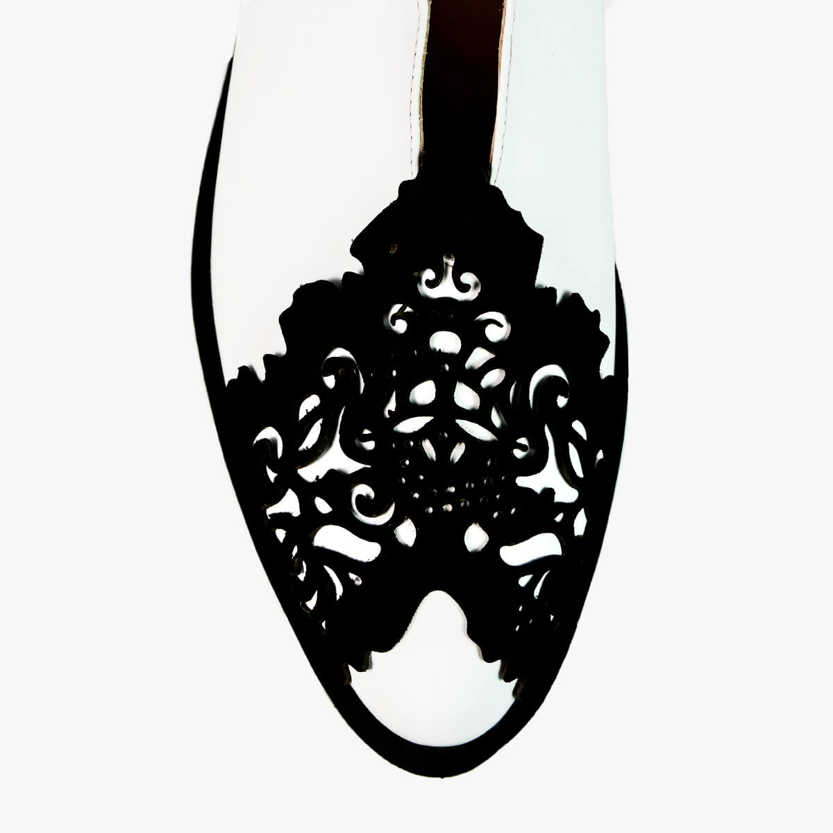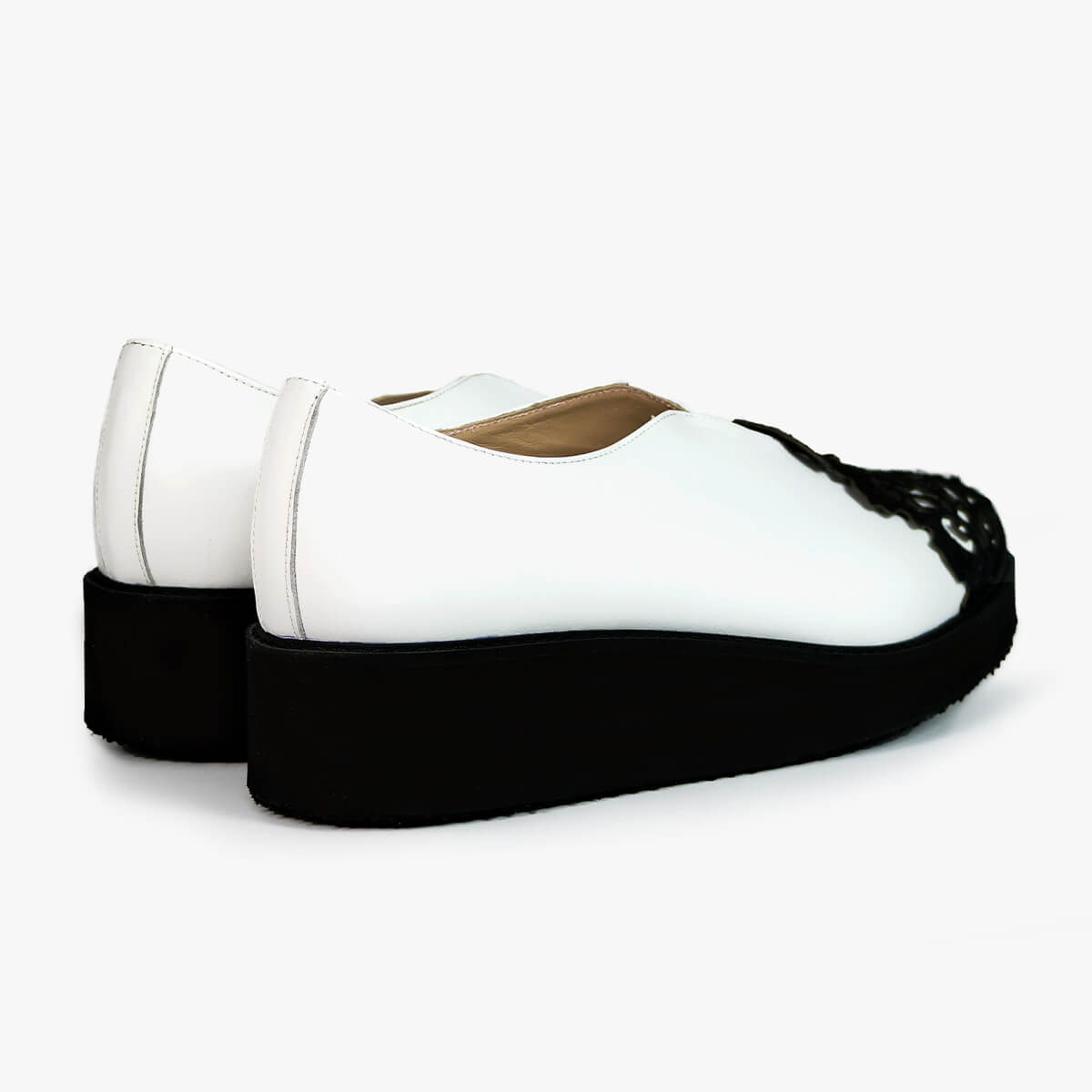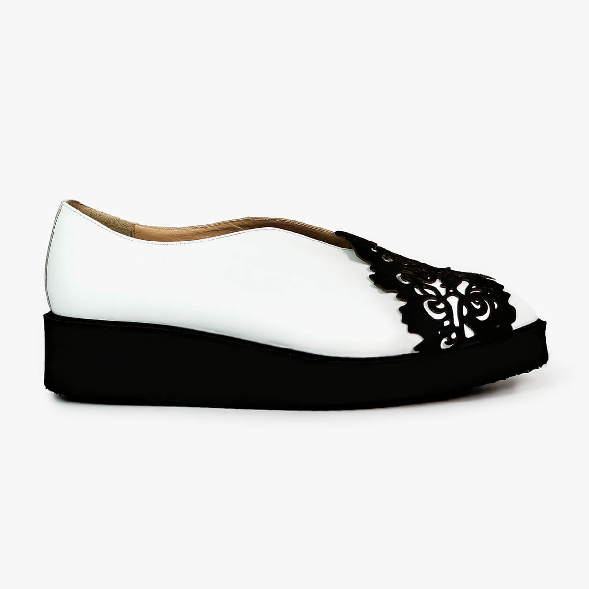 Starita slip-on shoes instantly catch the eye with a white finish and delicate laser-cut patterns through the front. This design comes with a comfortable platform sole with memory foam insole and a slightly pointed toe.