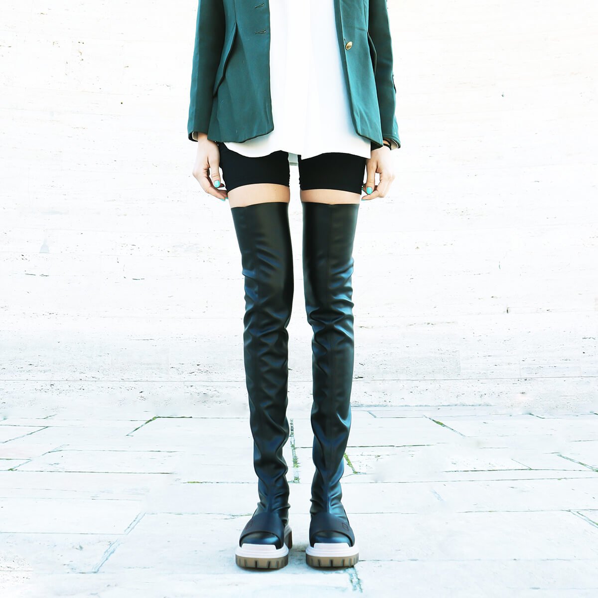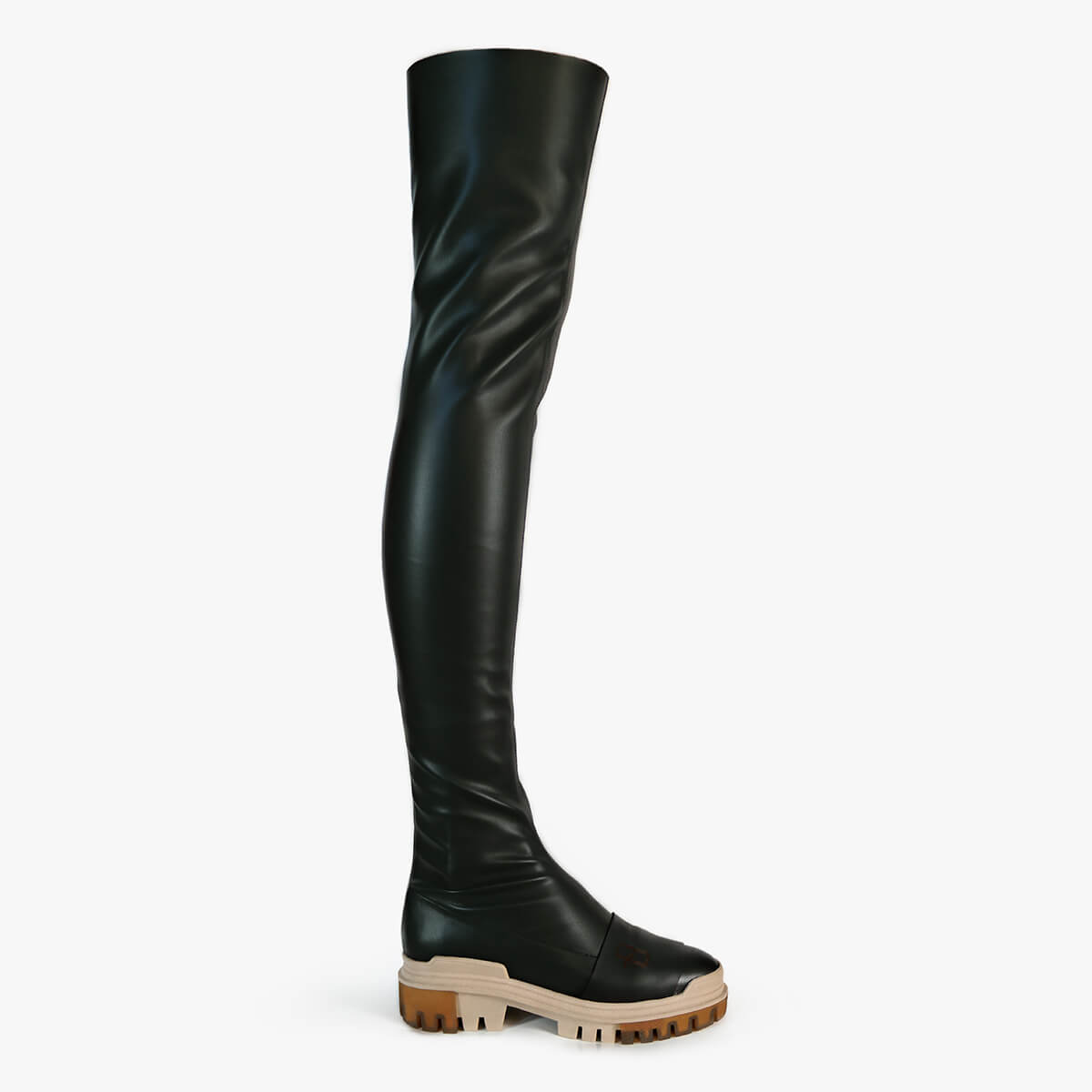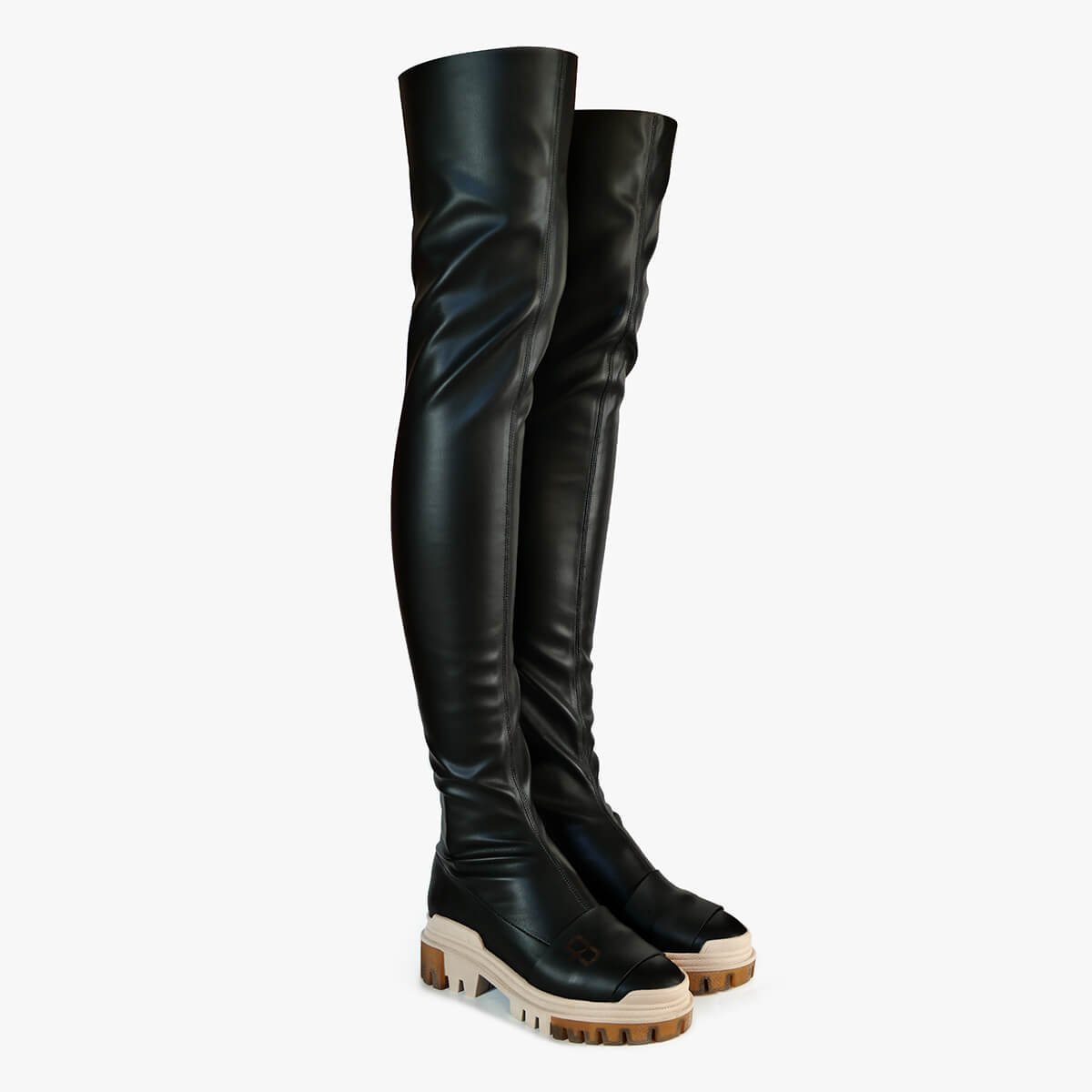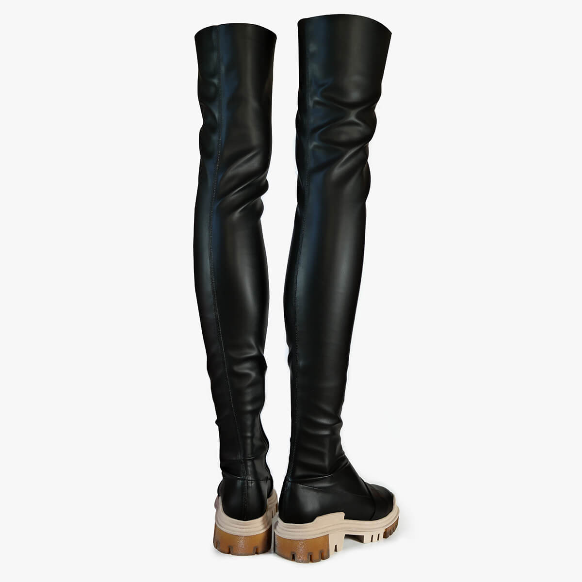 Set on a chunky rubber sole, with a rounded toe, Vorron thigh-high boots are beyond stunning. Handcrafted from faux stretch leather that encases the contours of the leg for a seductive finish, these boots are the perfect element to elevate any outfit.